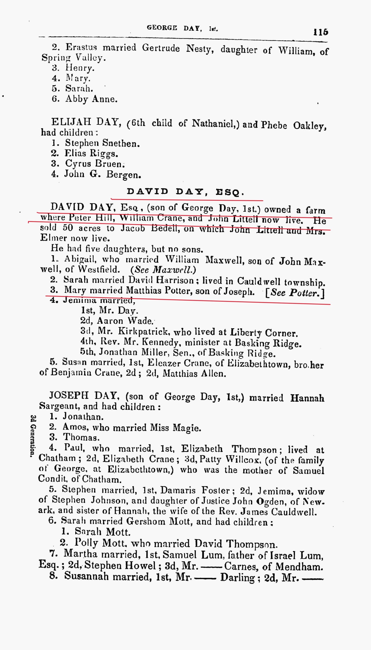 David Day, Esq. – https://archive.org/details/familyrecordsorg00litt/page/114/mode/2up | Littell’s Family Records of the First Settlers of Passaic Valley, 1851, p. 114 and 112.